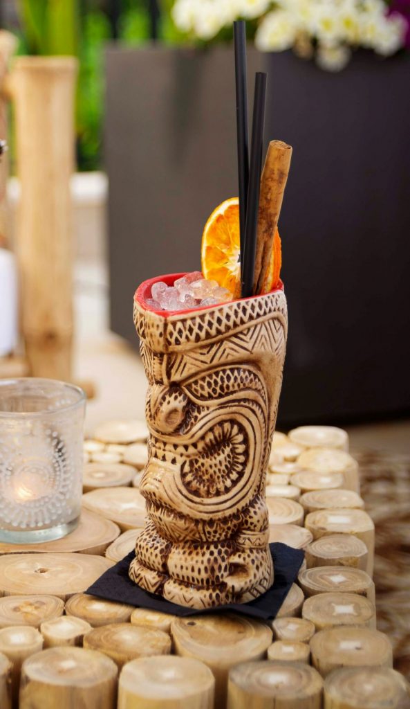 Shaker avec de la glace et filtrer dans tiki rempli de glaçons. Garnir d’une tranche d’ananas ou d’une cerise au marasquin pour accentuer l’aspect tropical.